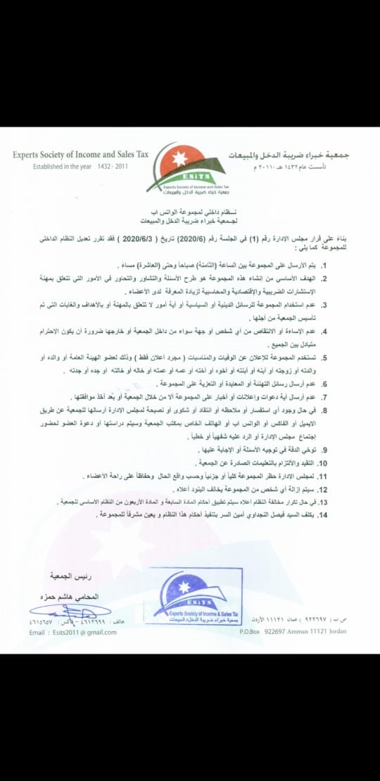 فيما يلي قائمة بالأنظمة المتبعة داخل جمعية خبراء ضريبة الدخل والمبيعات